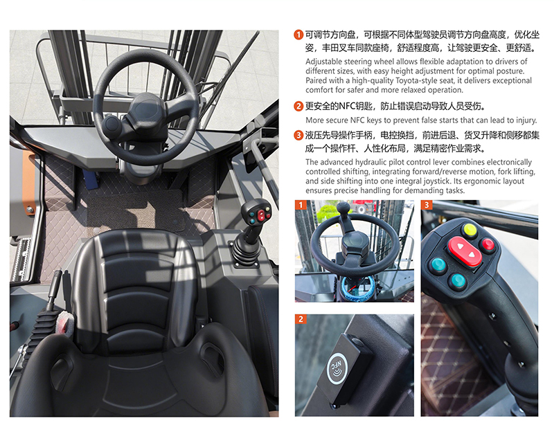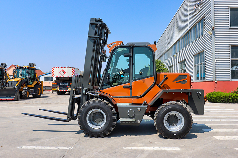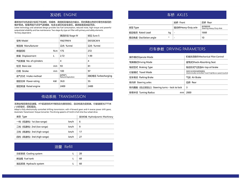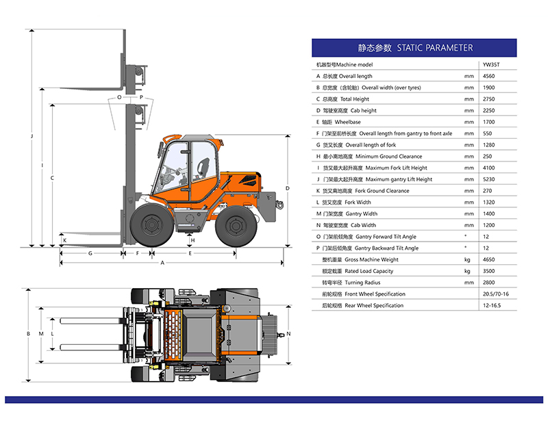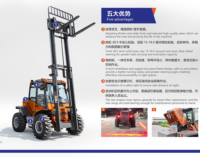 一體式越野叉車(chē)(YW35T)為加厚貨叉,精選鋼材提升載重,前輪20.5半實(shí)心輪胎,后輪12-16.5真空鋼絲輪胎,后輪轉(zhuǎn)向,承載 力和脫困能力更強(qiáng),軸距短,一體式車(chē)架,無(wú)鉸接,轉(zhuǎn)彎半徑小,轉(zhuǎn)向角度大,更適合狹小 空間作業(yè),加裝安全示寬警示燈,保證夜間安全距離作業(yè),發(fā)動(dòng)機(jī)后機(jī)蓋可向上開(kāi)啟,更換濾芯更容易,后方擋泥板承載力強(qiáng),可 供保養(yǎng)人員站立。